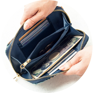 ●仕様:開閉=ラウンドファスナー式、ポケット=外部にホック式スマホケース1個、内部に札入れ2個・ファスナー式小銭入れ(仕切り兼用)1個・カード入れ6個付き