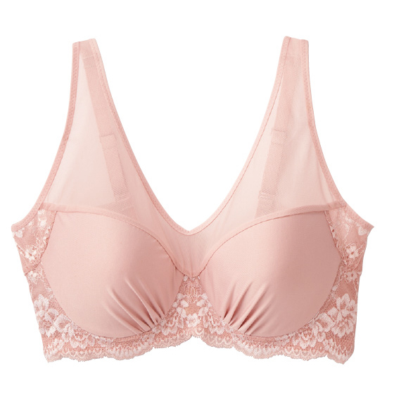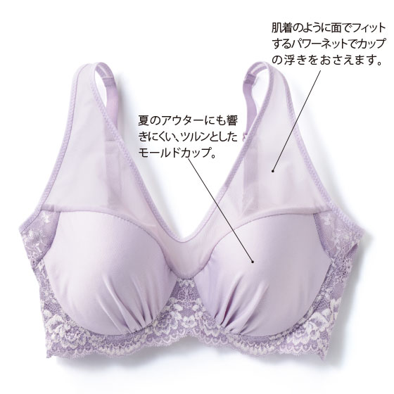 超ソフトなワイヤを、肌当たりを和らげるために外付けに。バストの形をきれいに保ち、長時間着けていてもラクラクです。わき高設計と上辺テープを使わないフラット仕上げで、わき下の段差を軽減。ボーン入りでサイドをしっかり押さえます。カップ肌側は吸汗速乾機能付きのメッシュ素材。身生地には薄手のパワーネットを採用しました。