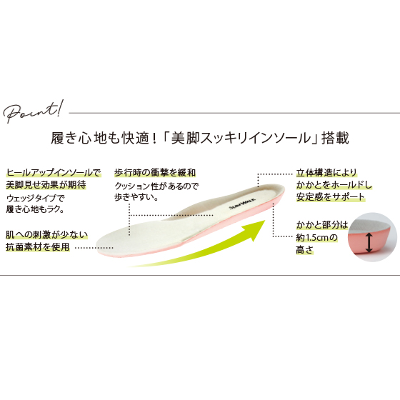 ヒールアップインソールで、美脚見せ効果が期待。クッション性があるので歩きやすく、立体構造によりかかとをホールドし、安定感をサポート。肌への刺激が少ない抗菌素材を使用。かかと部分は約1.5cmの高さ。