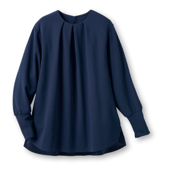 上品なジョーゼットポンチが全方向に伸びて、どんな姿勢もラクラク。袖下に少しゆとりをとったミニドルマン袖が、こなれたシルエットをつくって着映え感があります。