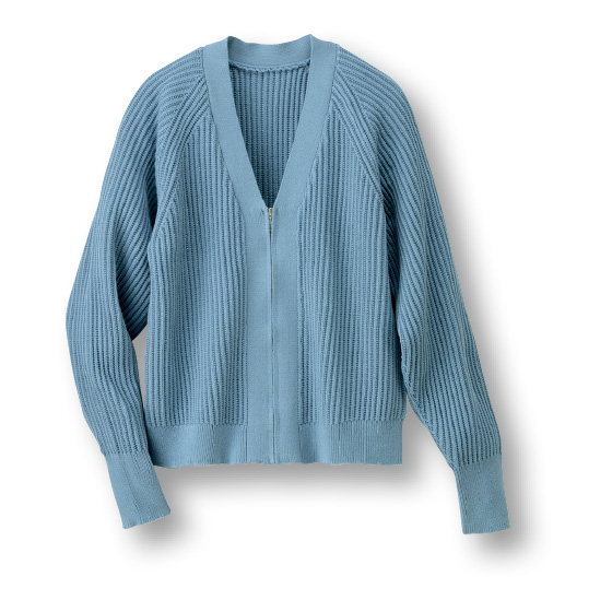 くっきりと縦目が立つ変形畦編みのニットカーデ。軽い編み地とジップ仕立てのすっきり感で、ボリュームのあるボトムやワンピに好相性。コンパクトな丈感が脚長見せも叶えます。