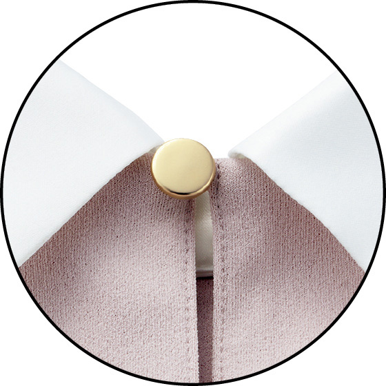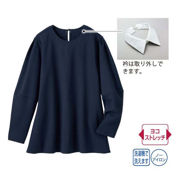 布帛見えするきれいめカットソー素材を、配色の付け衿できちんとした印象に。衿を外せばほどよいカジュアル感で気軽に着られます。