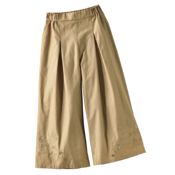 裾にキッピスのヴァアプッカ柄を刺繍したゆったりガウチョ。スラブ生地のようにさわやかなタッチの裏ツイル使いです。腰回りにゆとりのあるサイズ感でも、前タックですっきり見え。※通年着用できます。
