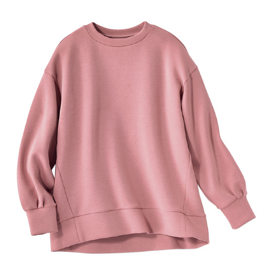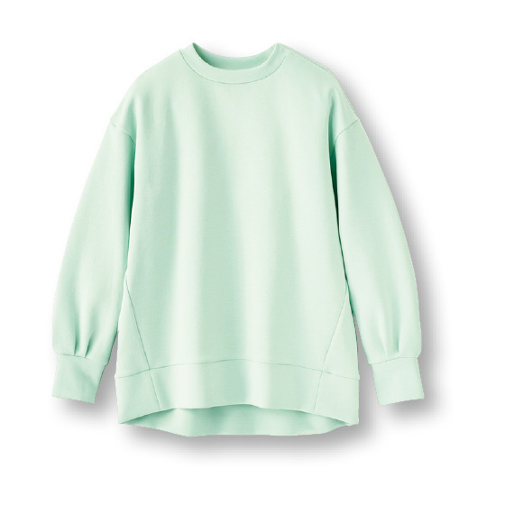 表地と裏地の間を中糸が立つように編み込むことで、2層の間に空気をため込み暖か。もっちりソフトな風合いで、体の線を拾いにくいハリ感もある素材です。
