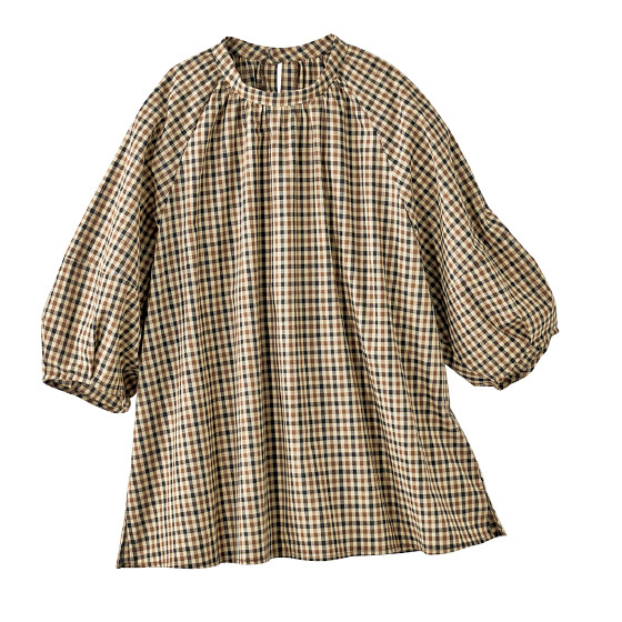 衿元ギャザーと立体的な袖でふんわりシルエットに。