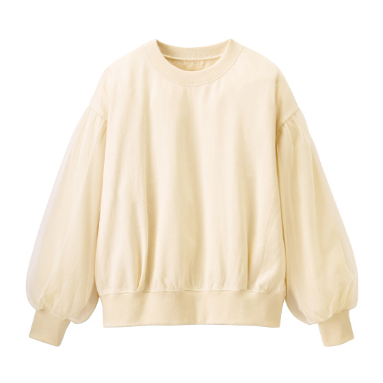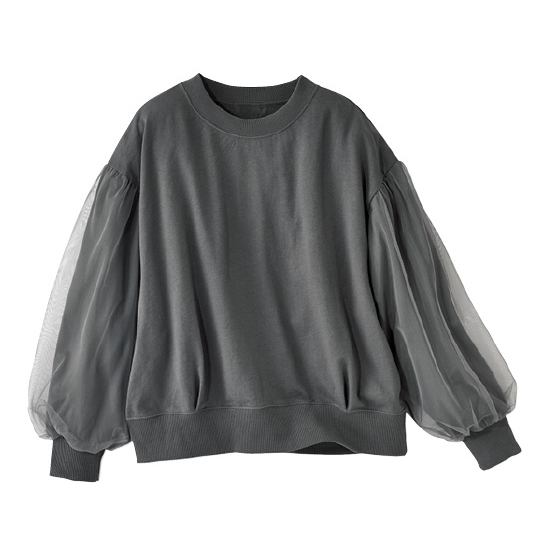 カジュアルになりがちなスウェットに、同色の袖チュールをプラス。大人可愛いふんわり感で、お出かけ気分が上がります。
