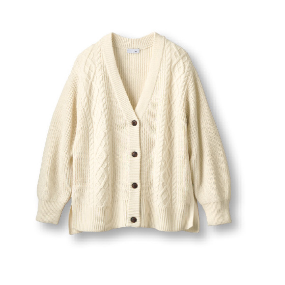 ふっくら編み上げたウール混ニットに、ケーブル柄のアクセント。ゆったりトップスの上にもはおりやすいサイズ感で、コートにはまだ早い時季に便利です。