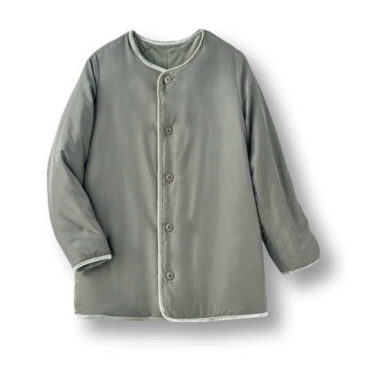 薄く中わたをはさんだ暖かなコートです。片面はベロアキルト、もう片面はステッチレスのタフタで、コーデに合わせて1着で2着分の着回し力。かさばるコート収納も省スペースですみます。ゆる服の上にも着られるゆったりしたサイズ感でヘビロテ。