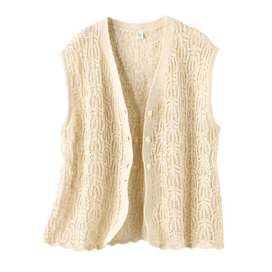 手編みのような風合いの透かしベストは、いつもの服に合わせるだけで華やかさがアップ。ドライタッチな質感で重ね着してもサラッと快適です。