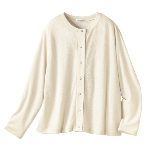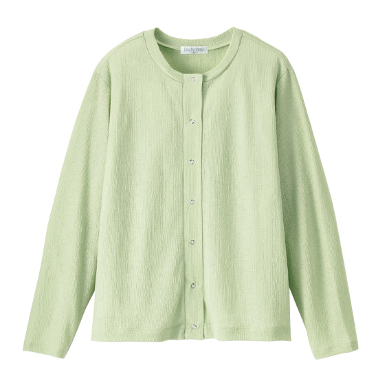表面感のある楊柳のさらさらカットソーは、ほんのり透けて涼やか。シルバー色のスナップボタンがカジュアルなアクセント。薄手で持ち運びしやすく、冷房対策にもひと役。