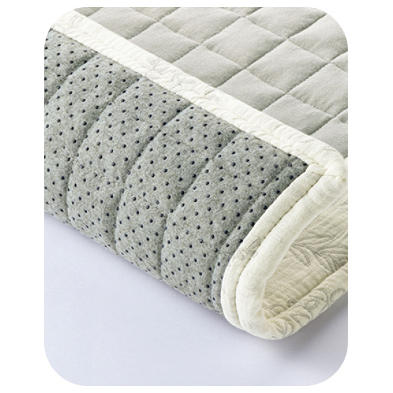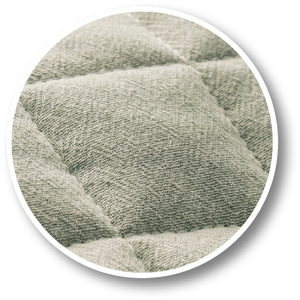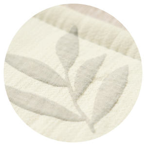 キルト部分は洗いざらし綿。使いはじめからやわらか、ふんわり綿素材が汗を吸って快適。額縁部分はリーフ柄。ふくれ織でナチュラルな柄を表情豊かにデザイン。