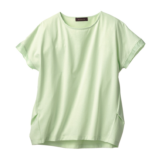 後ろ身頃にタック使いの立体感で、体の線を美カバー。袖口のシアー切替が涼やかさを添えるプルオーバーです。わき汗や背汗が染み出しにくい加工で、真夏の外出もきれい顔。