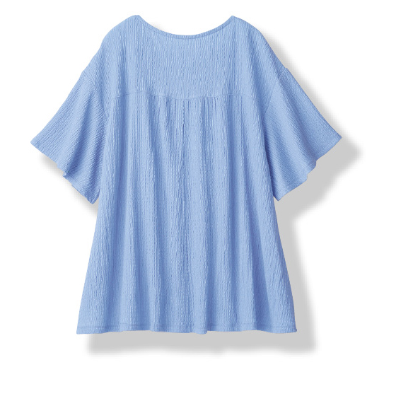 ポコポコとした表面感のあるカットソー素材。伸縮性があるので着心地がよく、ギャザーやフレア使いで体形カバーも。