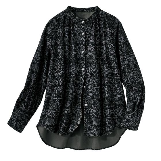 日本製の生地に表起毛加工とワッシャー加工を施し、よりソフトな風合いに。衿はバンドカラーで顔回りがすっきり見え、ギャザーやタック使いと日本製ならではの細かなフロッキープリントで華やかな印象に。