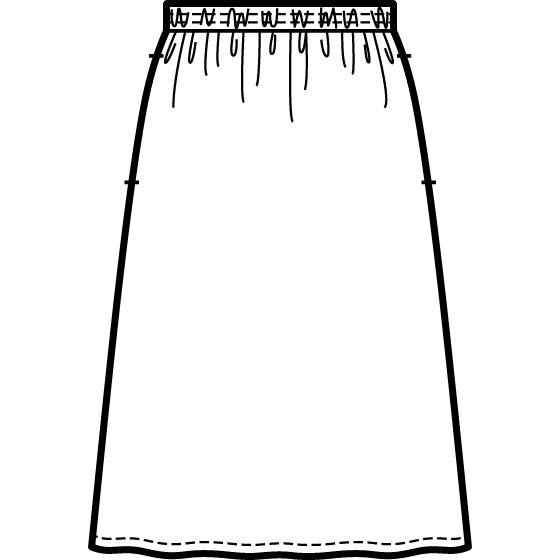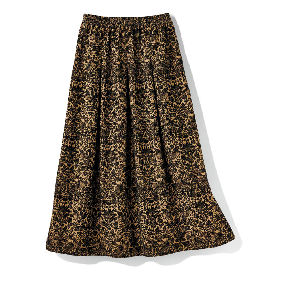 フロッキープリントのスカート。全体的に入ったギャザーでふんわりと腰回りを包み込み、前側タックでおなか回りもカバー。着脱がラクなウエスト総ゴム仕様。※春秋冬、3シーズン着用できます。