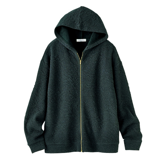 キルト風の凹凸が上品柄になったジャカード素材。フード付きでもカジュアルすぎず、大人の街コーデに使えます。軽くはおれてコート前の季節から活躍。スカートにも合う長すぎない丈。
