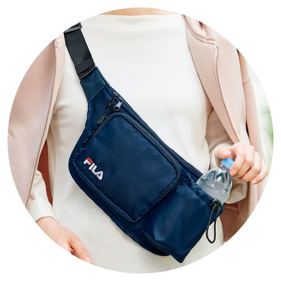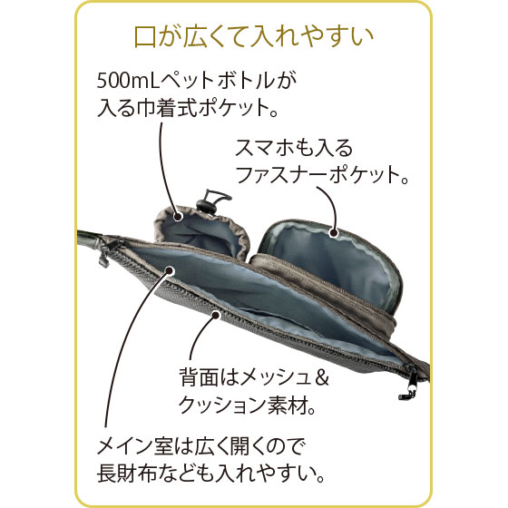 薄めのマチで、スリムに斜め掛けできるショルダー。スマホやペットボトルなどが出し入れしやすい外側ポケットが便利です。