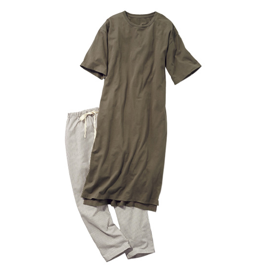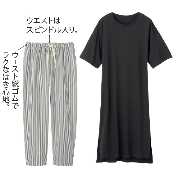 両サイドに裾スリットを入れたカットソーワンピと、ストライプ柄のコットン混パンツのセット。ゆるっとラクに着られて、それぞれ単品でも活躍します。※夏・秋に着用できます。