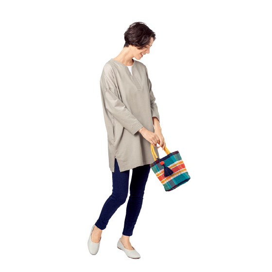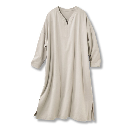 重ね着にも使えるゆったりシルエットに、ネックや裾スリットで抜け感を。程よい厚みの綿素材。