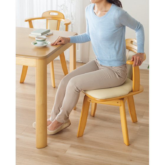 回転するから椅子の引きずりを軽減!ひじ掛け付きで立ち座りがラク!