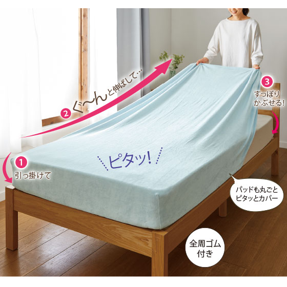 ベッドにもふとんにも装着可能な2way。湿気を吸って熱に変える「メルティウォーム」を使用。厚さ38cmまで対応。敷きふとんにもマットレスにも使えます。