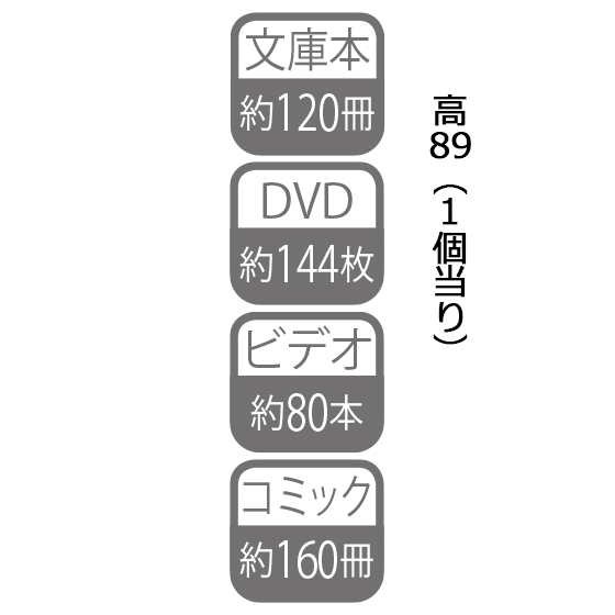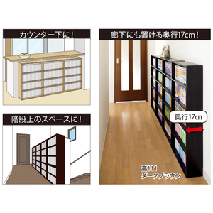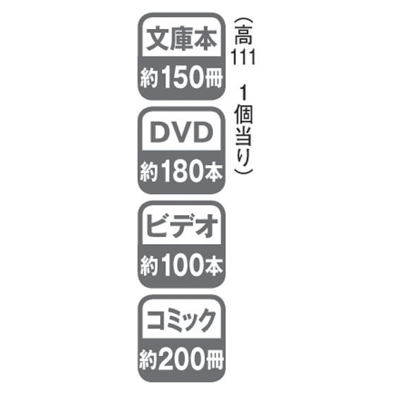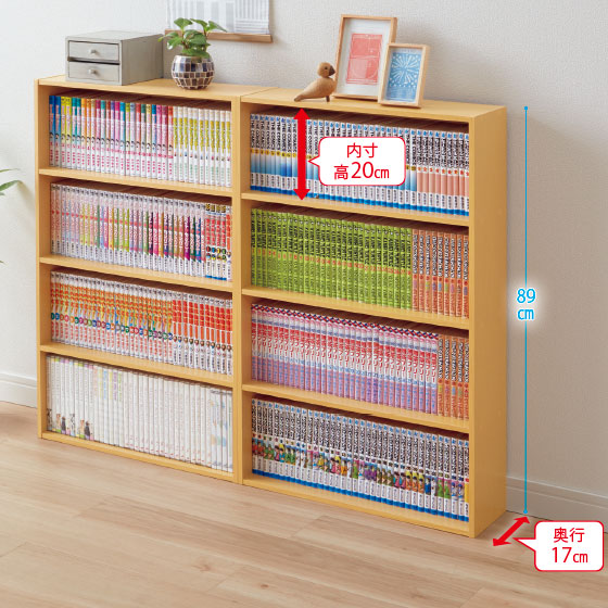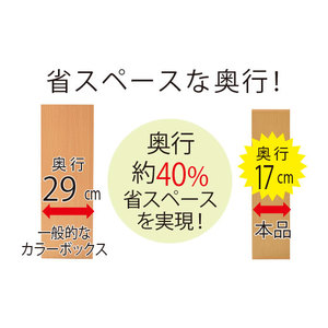 一般的なカラーボックスより奥行を約40%省スペース化した設計。文庫本・コミックが効率よくたっぷり収納できて、出し入れもスムーズ。