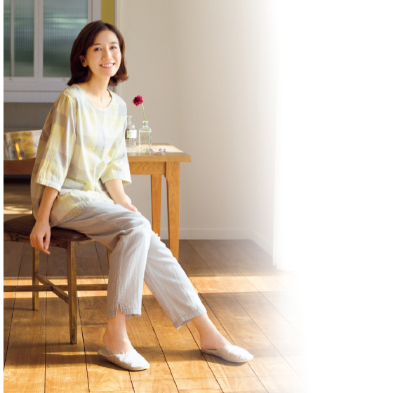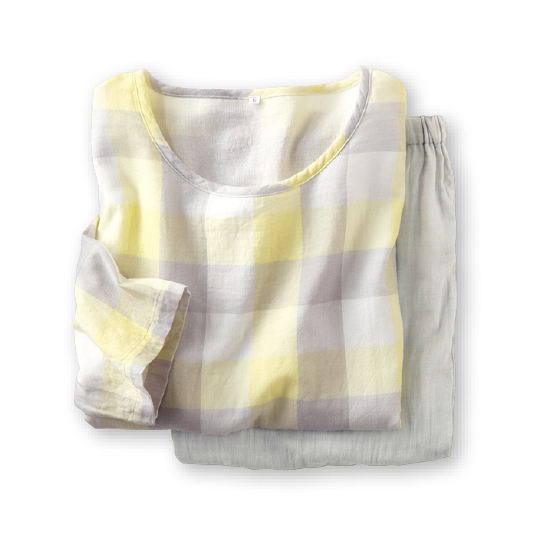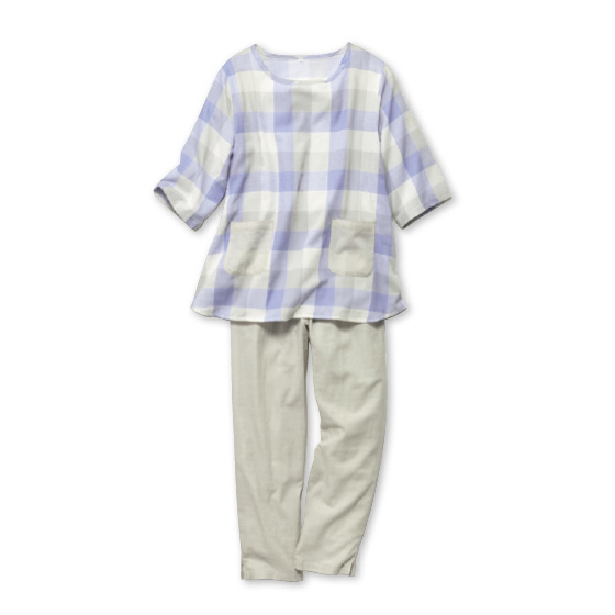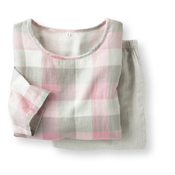 衿元涼やか、ふんわり2重ガーゼのパジャマ。7分袖&長ズボンで冷房対策にも。