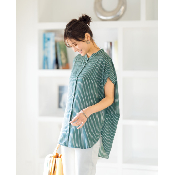 軽く柔らかで、風を着るようにエアリーな着心地。わきのタック使いで肌との空間が広いシルエットだから、ふわっと風を呼び入れて涼しく、体形カバーも叶います。