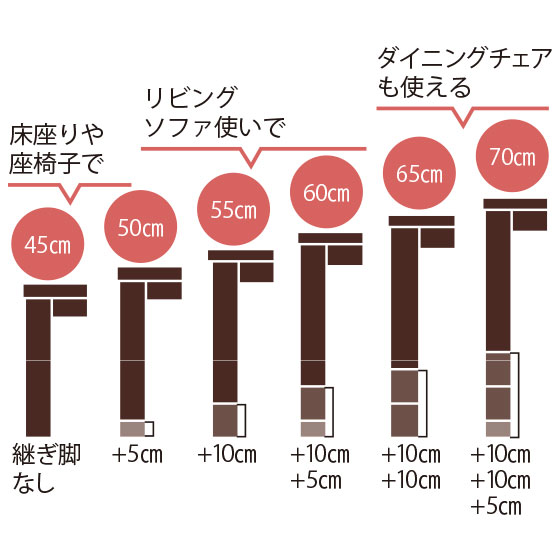3個の継ぎ脚を組み合わせて、こたつの高さを6段階に調節。