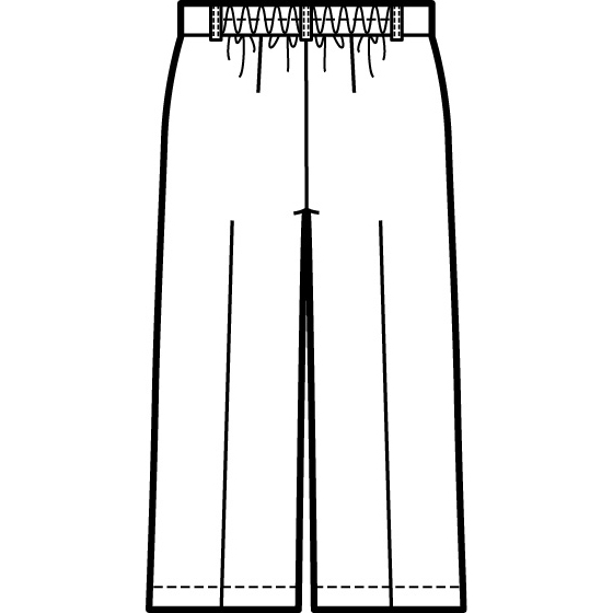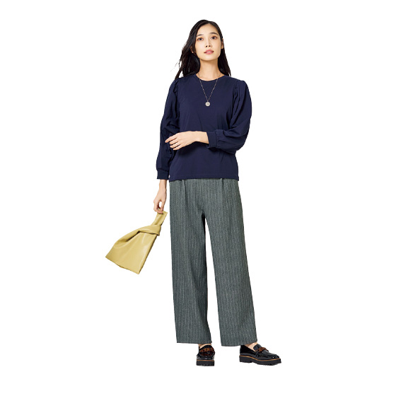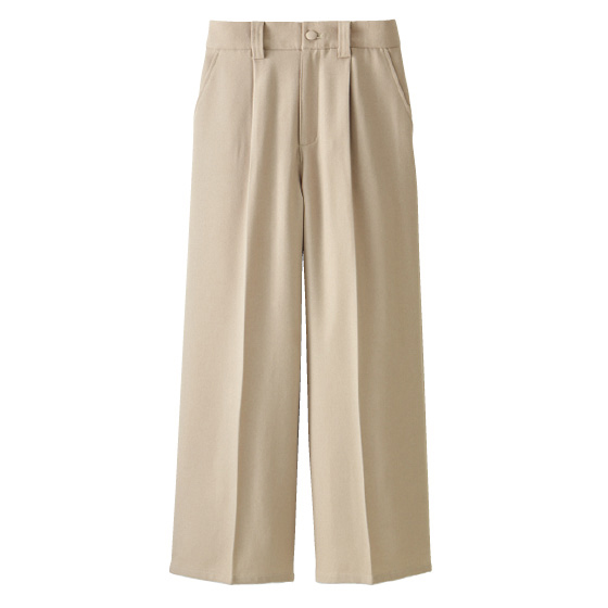 太すぎないワイドシルエットではきやすく、センタープレスできちんと感をアップ。左右のタック使いでおなかまわりをカバー。ウエストは後ろゴム入りでラクなはき心地。※通年着用できます。