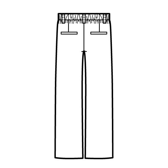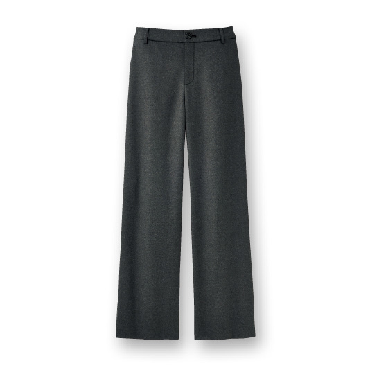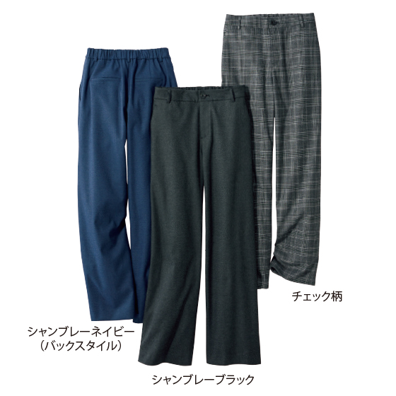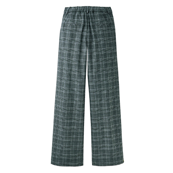 ウエストから裾へ一直線に落ちて、脚ラインをすっきり見せるフル丈ワイド。ウエストには前カーブ、後ろは平ゴム使いで、おとながラクに心地よくはけるパターンです。