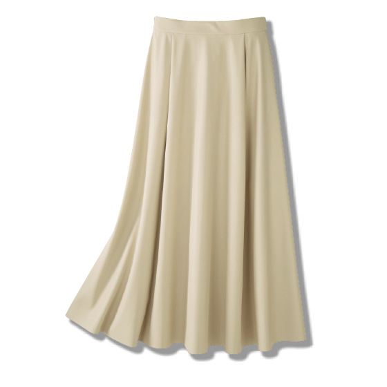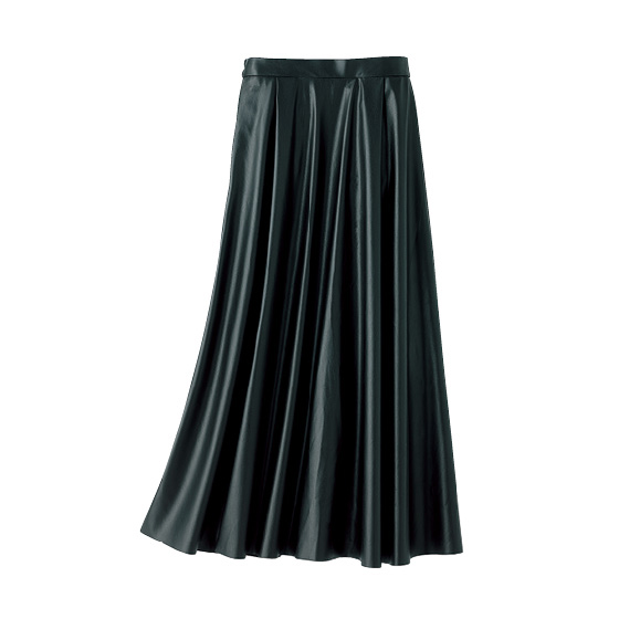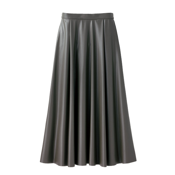 上質感のあるやわらかい合皮生地をたっぷり使ったスカート。腰回りはすっきり、裾に向かってドレープの出る美シルエットです。※春秋冬、3シーズン着用できます。