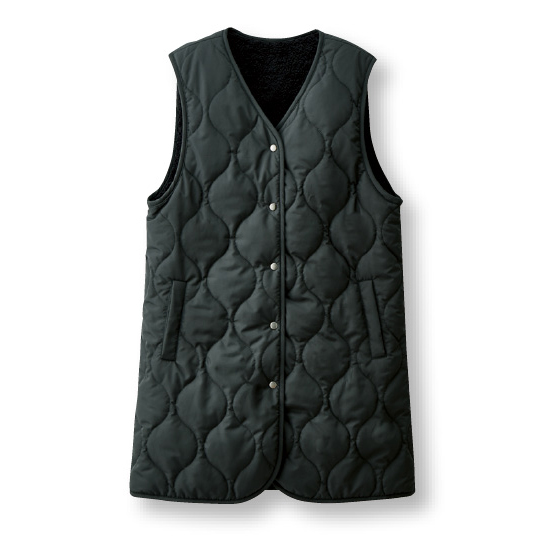 表は薄わた入りウエーブキルト、裏はボアの2枚仕立て。袖なしで家事がラク。脱ぎ着しやすいスナップ留め。