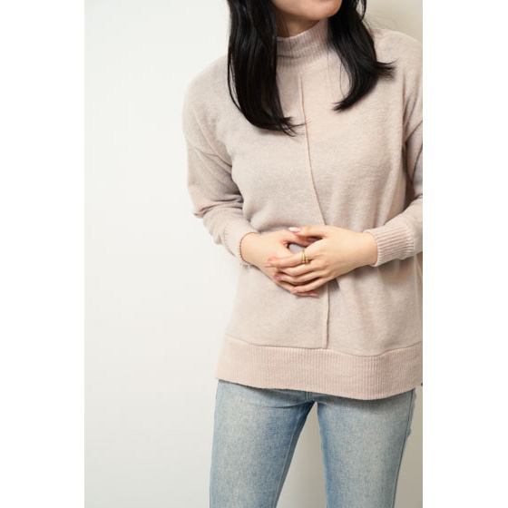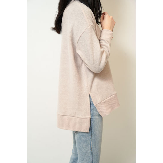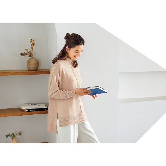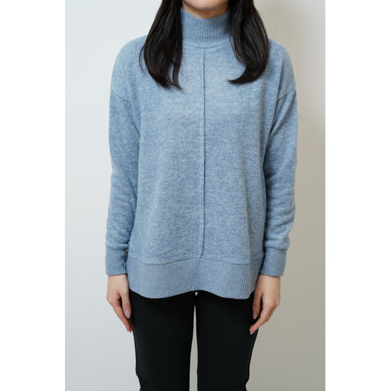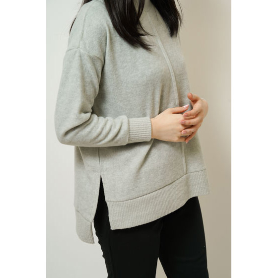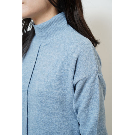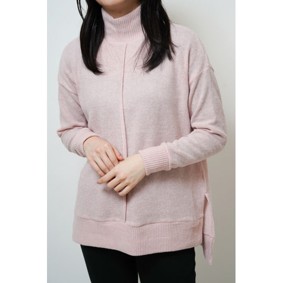 見た目はニットなのに、カットソー素材を使用。洗濯機で洗えて吊り干しもできるから、お手入れもラク。首元の太めリブがオシャレなアクセント。