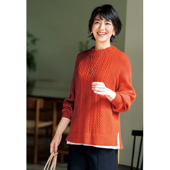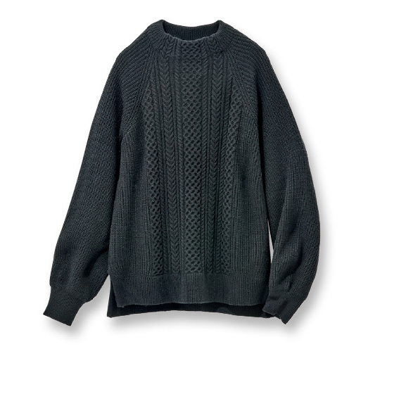 ラグラン袖でラクに着ながら、前身頃のケーブル柄でパッと冬映え。