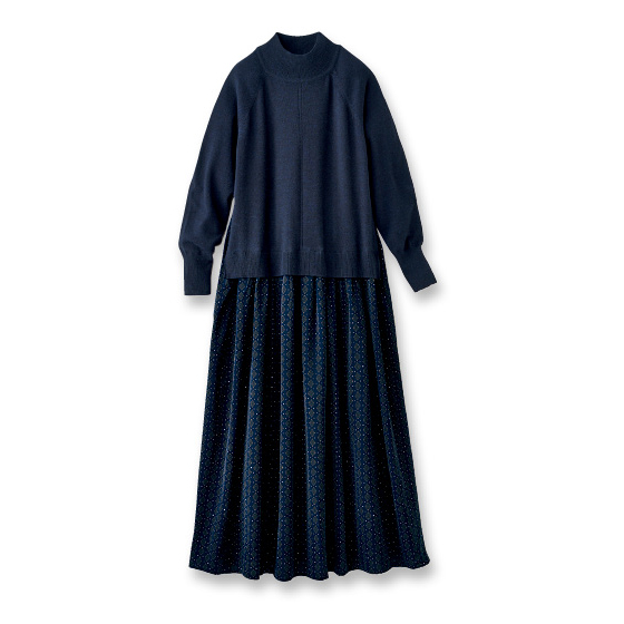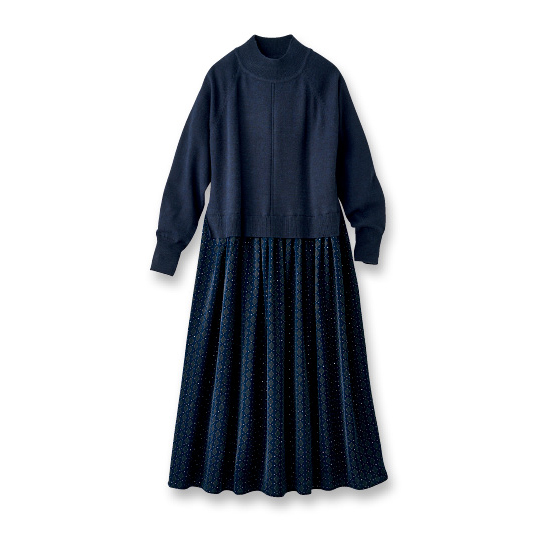 やわらかくちょうどいい肉感のニットに小紋柄のさらふわ生地のスカートを組み合わせてワンピース仕立てに。ニット裾のスリットでウエストすっきり見えして着心地もラク。着るだけで簡単にサマになる1枚。