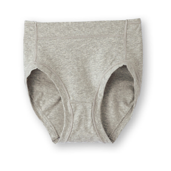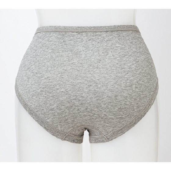 ウエスト前部と脚口はゴムを使わず、身生地を折り返したラクな仕様。薄手でしなやかな綿混生地を使い、ウエスト後ろゴムも生地でくるみました。レースを使わず、縫いしろはすべて外側で平らに倒し、肌側がなめらか。洗濯表示を生地裏に転写プリントし、ラベルの刺激をなくしました。