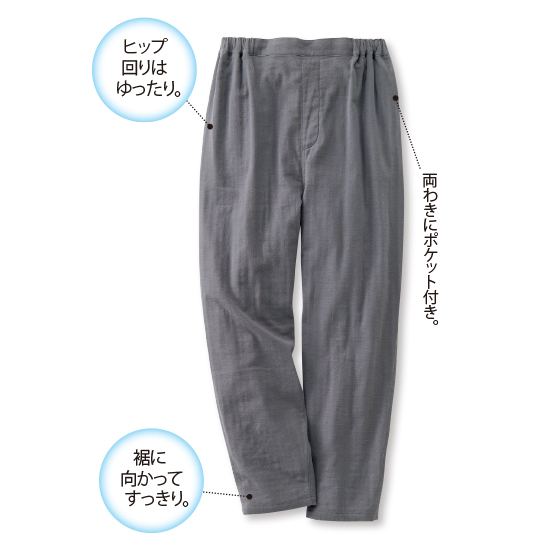ふんわり2重ガーゼに伸縮性がプラスされ、のびのびくつろげます。パジャマに部屋着に大活躍!