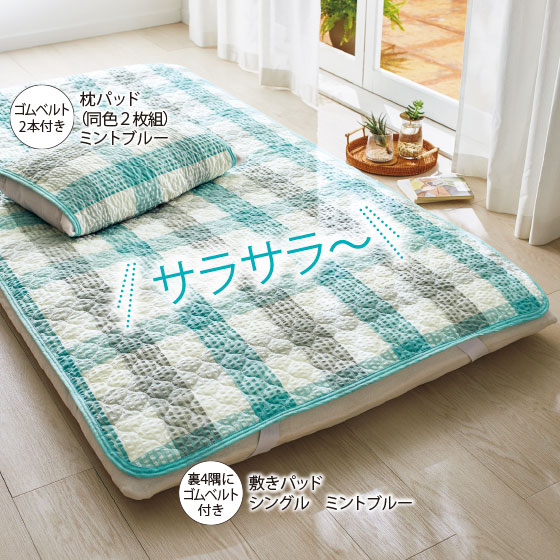 ●裏4隅にズレ防止のゴムベルト付き(敷きパッド)、ゴムベルト2本付き(枕パッド)