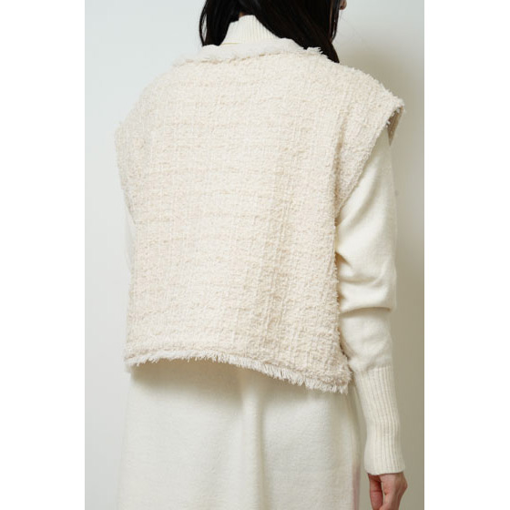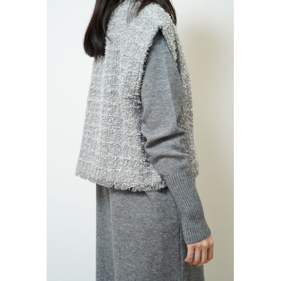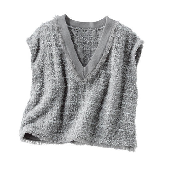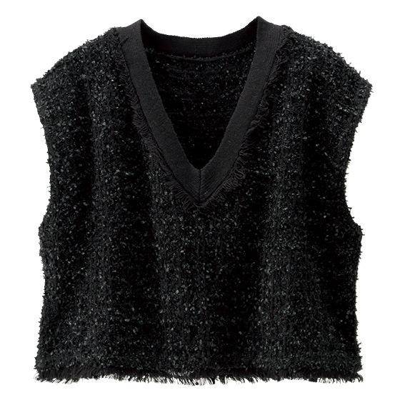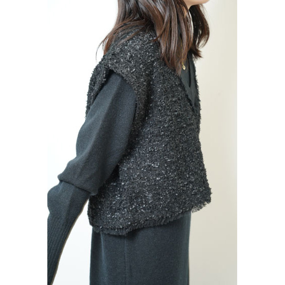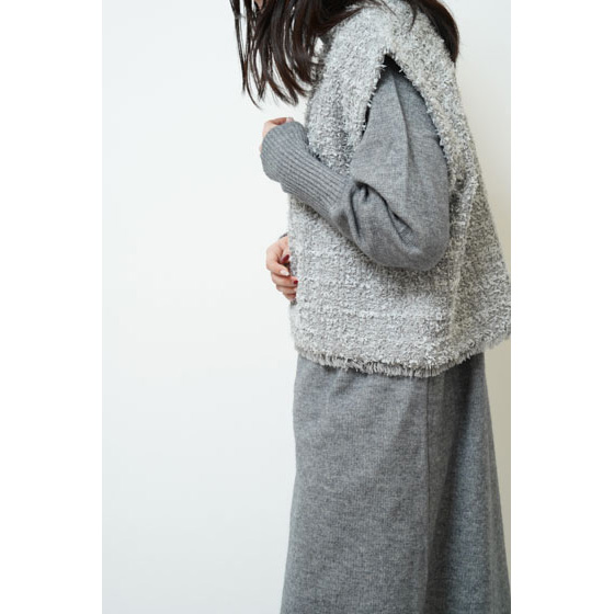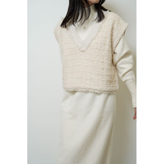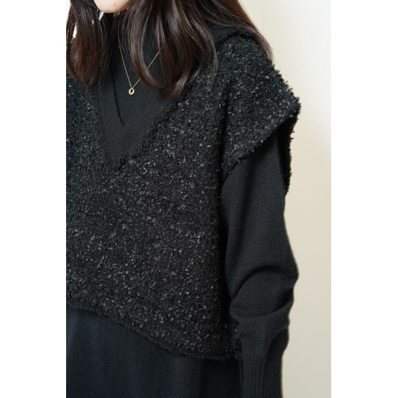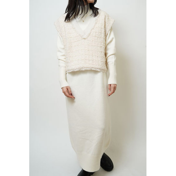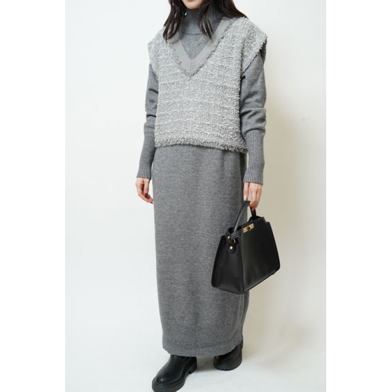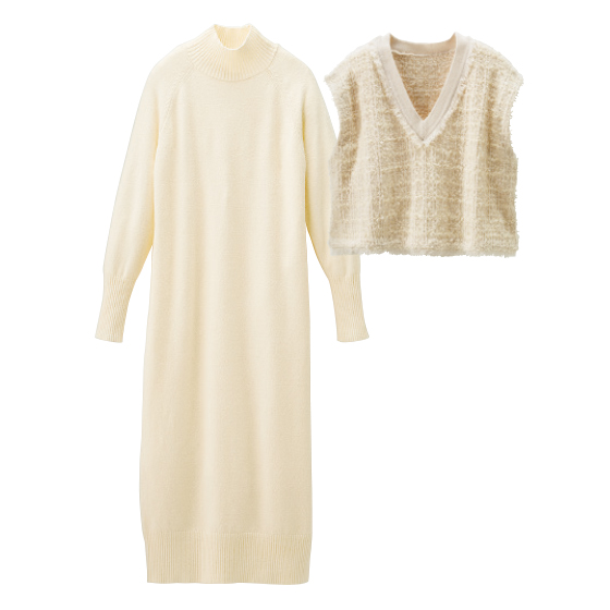 ●素材:ワンピース=ポリエステル30%・ナイロン25%・アクリル25%・レーヨン20%(ニット、天竺、静電気防止加工)、ベスト=アクリル55%・ポリエステル45%(ニット、ジャカード)