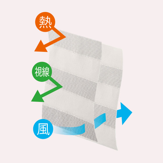 帝人フロンティアの遮熱性繊維を使用した生地「エコリエ(R)」を2重に織り上げました。遮熱効果が高いので、外部の温度を室内に伝えにくく、室内の温度を外部に逃がしにくくします。