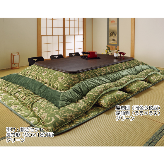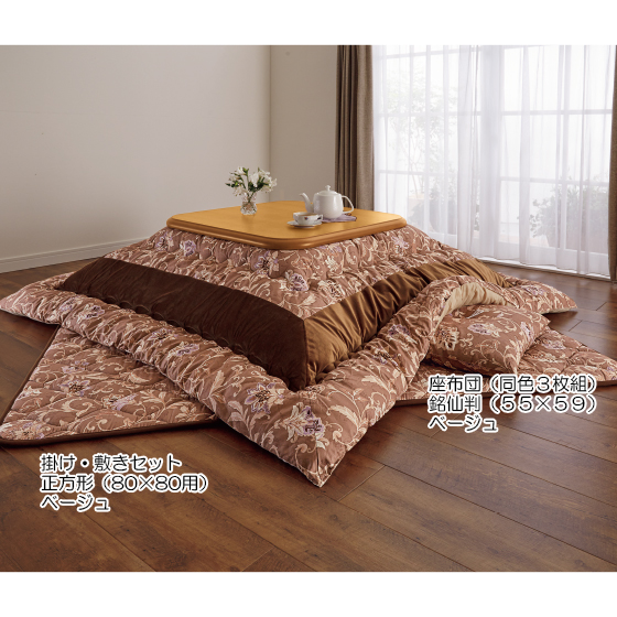 ●素材:<掛け>表側=柄部/綿100%、無地部/ポリエステル100%、裏側=綿100%、中材=ポリエステル100%(正方形(80×80用)=1.5kg、正方形(90×90用)=1.8kg、長方形(80×105用)=1.8kg、長方形(80×120用)=2.4kg、長方形(90×150用)=2.6kg、長方形(90×180用)=2.8kg)、<敷き>表側=綿100%、裏側=ポリエステル80%・綿20%、中材=ポリエステル100%(正方形(80×80用)=1.2kg、正方形(90×90用)=1.2kg、長方形(80×105用)=1.5kg、長方形(80×120用)=1.5kg、長方形(90×150用)=1.8kg、長方形(90×180用)=1.8kg)、<座布団>側地=綿100%、中材=綿80%・ポリエステル20%