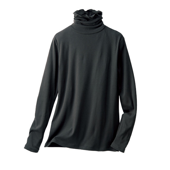 やわらかなオーガニックコットン混素材。薄手でモタつきにくいので、シャツやニットのインナーとして活躍します。表情のあるタートルネックで衿元が華やかな印象に。
