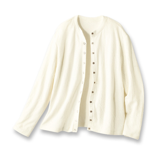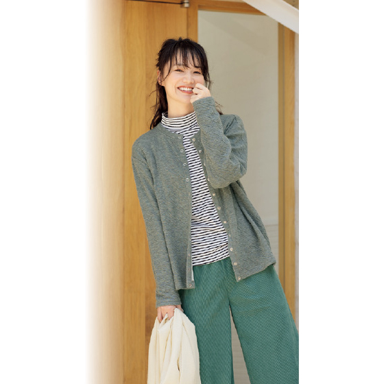 表はウール混でふんわり、裏は綿混でチクチク感を軽減。2枚の生地を合わせているので薄手ながら暖かく、自然なシワ感でやさしい印象に。