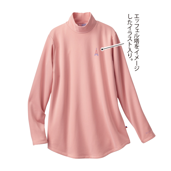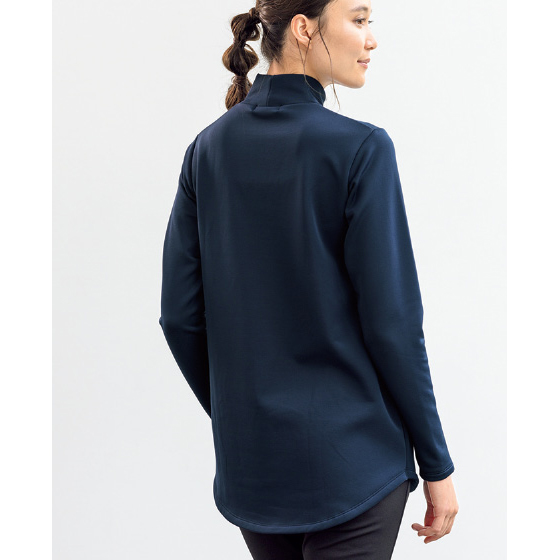 表はツヤ感、裏側はフリースの暖かい上品トップス。モックネックの衿やヒップが隠れる丈で冷えにくさと体形カバーも叶えます。
