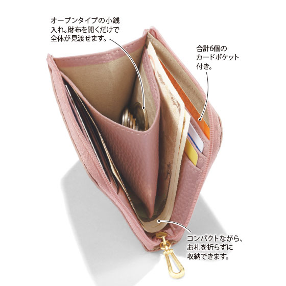 ●仕様:開閉=L字ファスナー式、ポケット=外部にオープン式1個、内部にオープン式1個・カードポケット6個付き