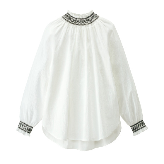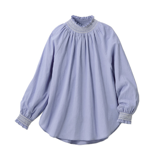 ネックと袖口の配色シャーリングで、気分が上がるふんわりブラウス。Tシャツみたいに簡単に着られて、パッと見映えのする1枚です。オーガニックコットンをブレンドした、薄手でやわらかな綿ローン仕立て。