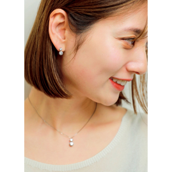 ラウンドブリリアントカットを施した大小2連のペンダントと、大小のモアサナイトが軽やかに揺れるピアスのツインシリーズ。