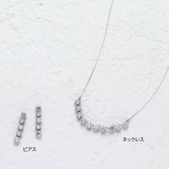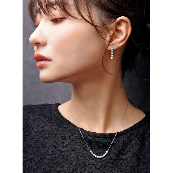 華やかなブリリアントカットが優雅に連なる、上品なデザインのネックレスとピアス。モアサナイトのゴージャスな輝きと存在感が堪能できます。