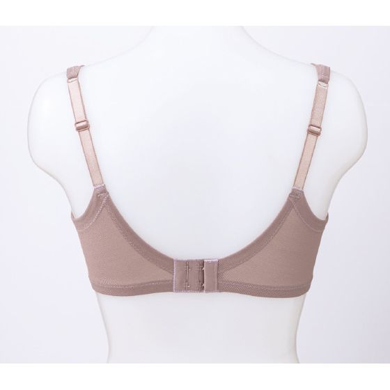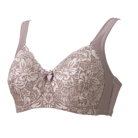 アンダーは寸法を見直して、ストレッチ素材に変え、くい込みを軽減。肩ひもは長くした上、テープを身生地で包んで肌当たりも向上。わき下辺は縁のテープを身生地でくるみ、ラクなつけ心地に。